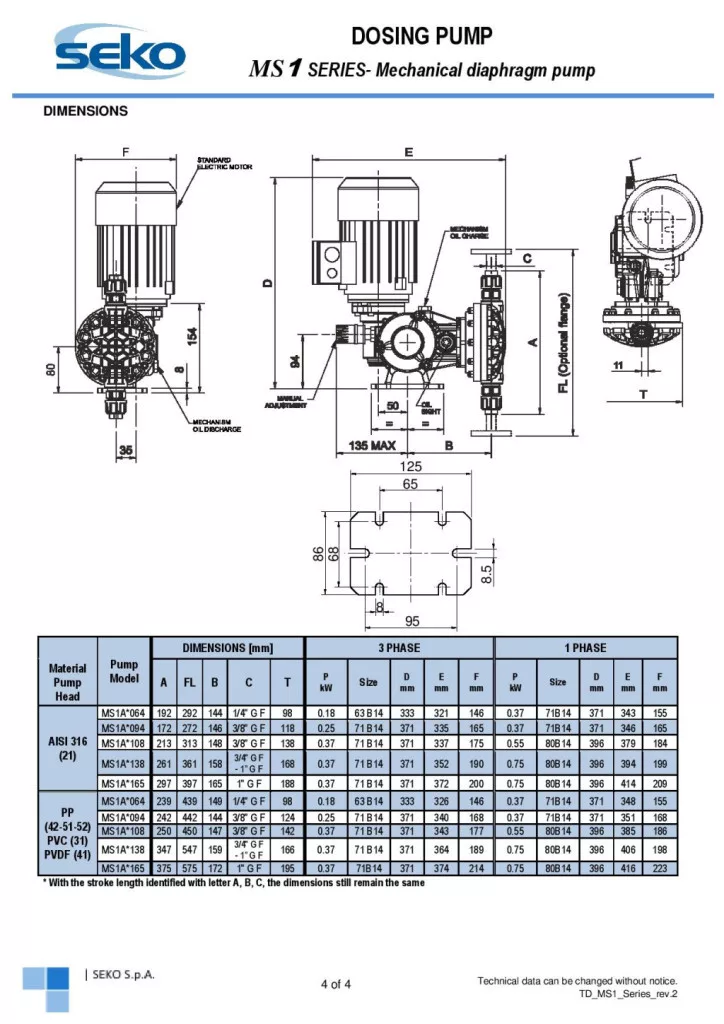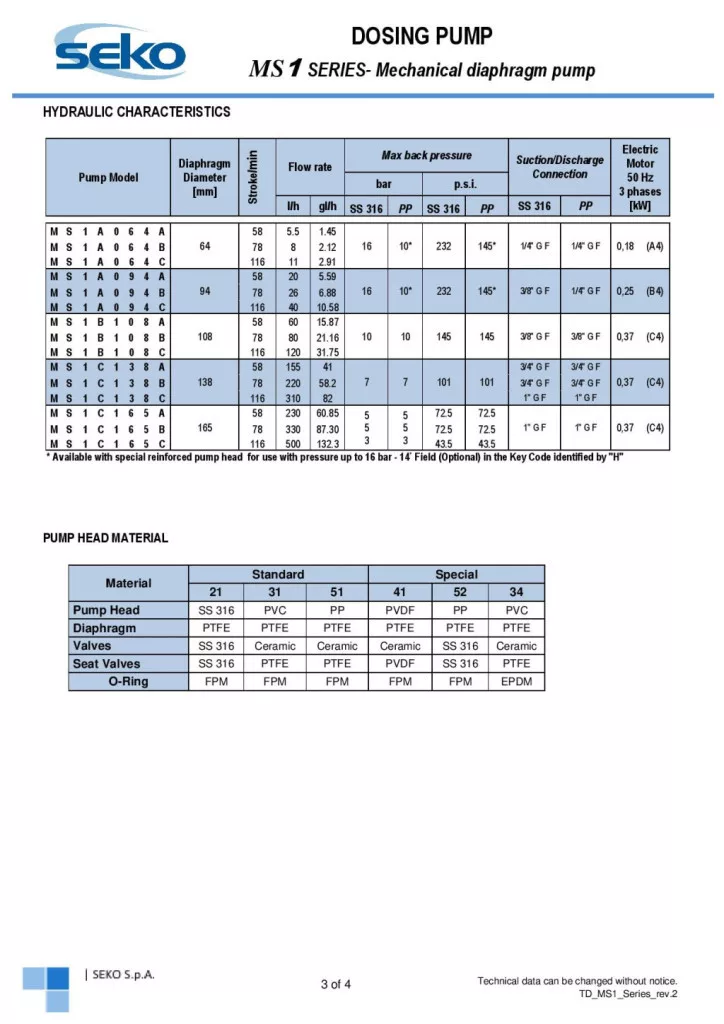 Az MS1 adagolószivattyúk széles teljesítménytartományban érhetők el, 5,5–500 l/óra szállítási kapacitással, legfeljebb 10 bar ellennyomás mellett. A berendezés többféle löketfrekvenciával működhet (58, 78 vagy 116 löket/perc), a löket hossza pedig 2, 4 vagy 6 mm lehet, így a szivattyú különböző adagolási feladatokra optimalizálható.