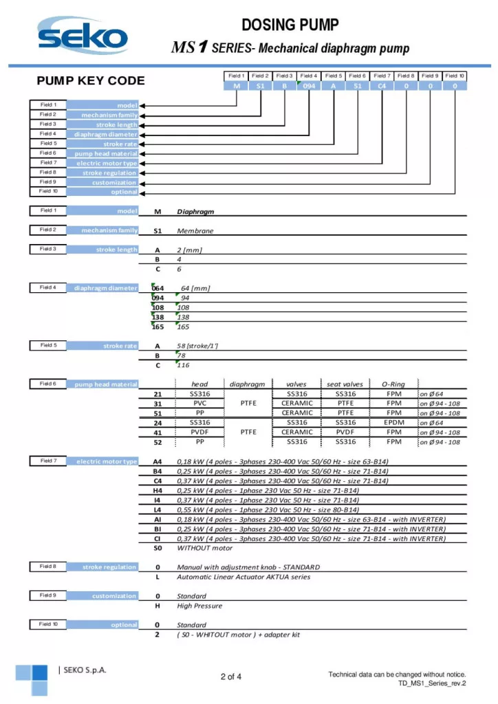 Az MS1 adagolószivattyúk széles teljesítménytartományban érhetők el, 5,5–500 l/óra szállítási kapacitással, legfeljebb 10 bar ellennyomás mellett. A berendezés többféle löketfrekvenciával működhet (58, 78 vagy 116 löket/perc), a löket hossza pedig 2, 4 vagy 6 mm lehet, így a szivattyú különböző adagolási feladatokra optimalizálható.