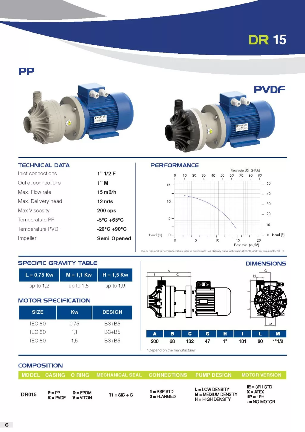 Dragon 15 m3/h kapacitású PP házas csúszógyűrűs vegyi centrifugál szivattyú EPDM, 1 fázis