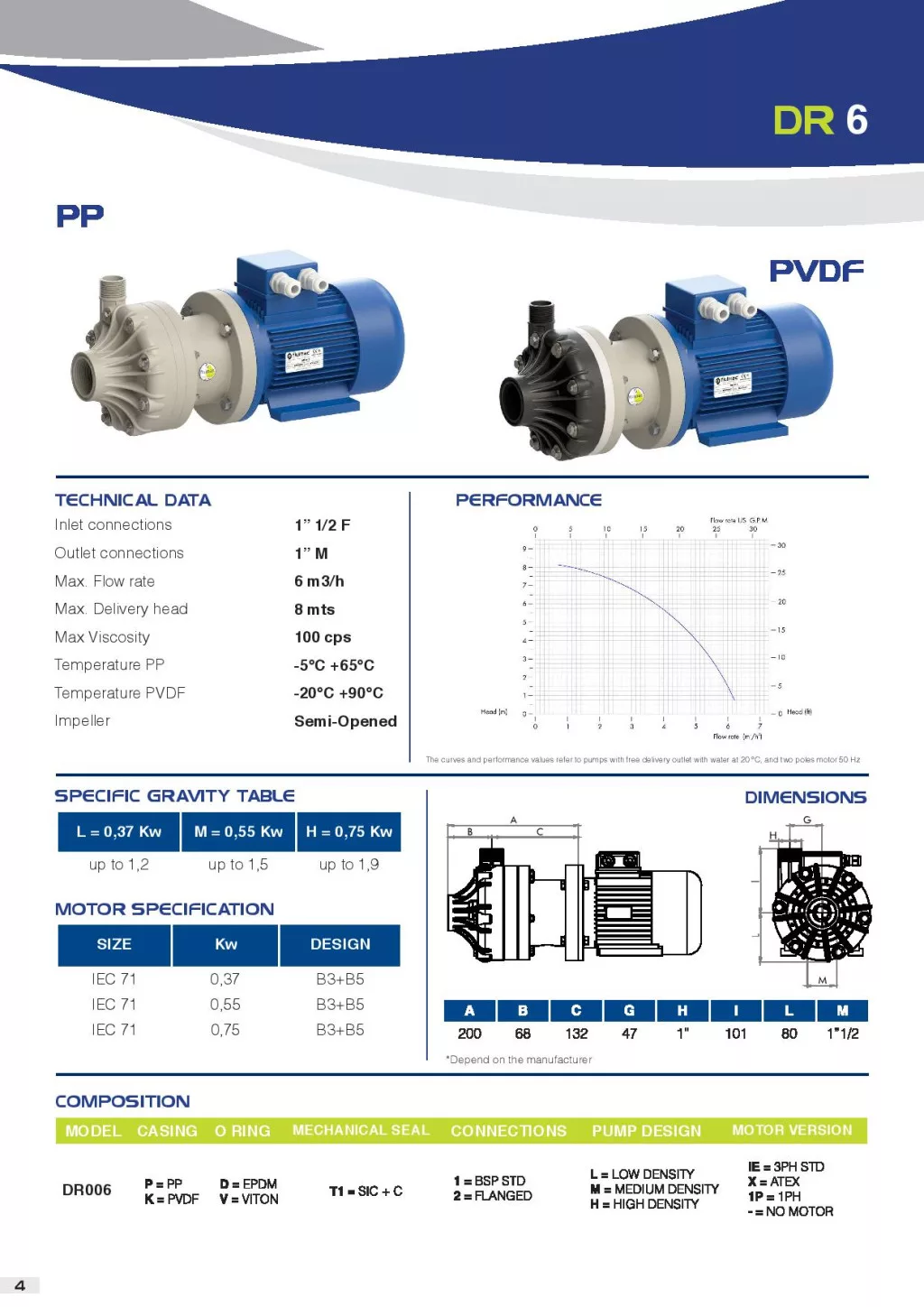 Dragon 6 m3/h kapacitású PP házas csúszógyűrűs vegyi centrifugál szivattyú EPDM, 1 fázis