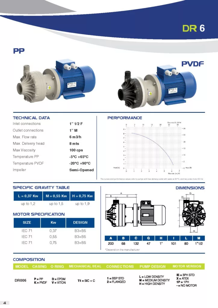 Dragon 6 m3/h kapacitású PP házas csúszógyűrűs vegyi centrifugál szivattyú Viton, 3 fázis